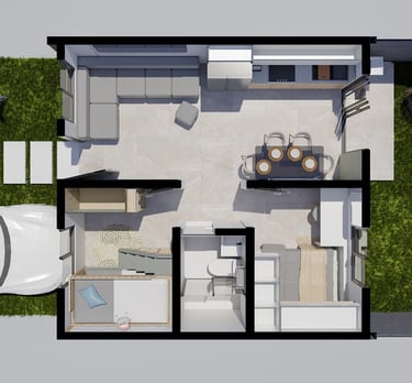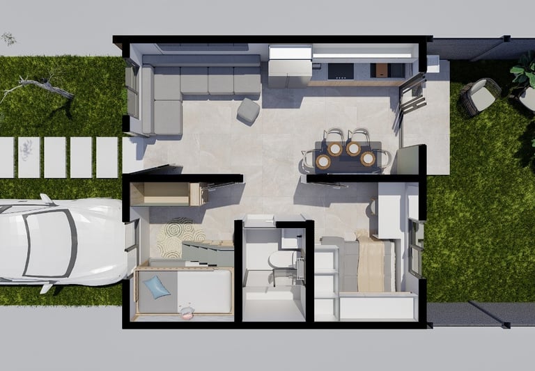 Módulo de vivienda 2 habitaciones, baño, sala comedor, lavandería. En un áre de 90 m².